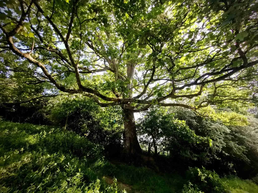 Fairy Lane leads into an open field with views of the Tor. If you take a slight detour to the top corner of the field, you will find an English oak standing in the hedgerow. Its branches reach out horizontally, spiralling and twisting, while the two main trunks are fused, resembling snakes mating. This is what the locals call the Wiggly Oak.