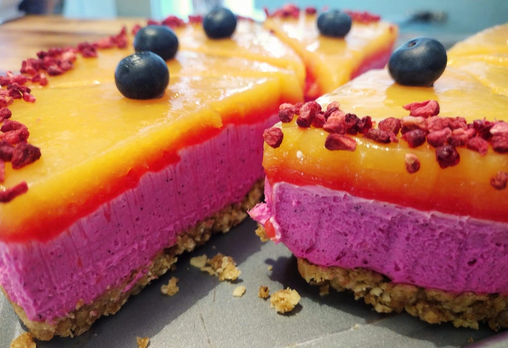 And that was our Summer Solstice adventure in 2024. We took off to the Pyramid Cafe in Glastonbury High Street—an excellent, fully vegan cafe that we recommend you visit and try one of their exquisite cheesecakes—the Dragon Cheesecake—picture below—tasted even better than it looks.