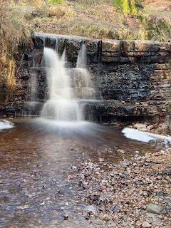 Although the waterfall is about 1 km from Hollies Car Park, no signposts guide you to it. To reach it, head to the right of the information boards at the car park and walk south-southwest. Follow the rough track downhill, disappearing into the surrounding vegetation and scrub. As you walk, listen for the sound of running water in the distance.