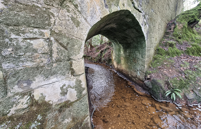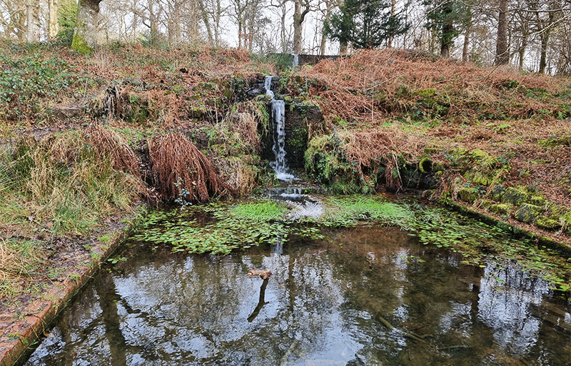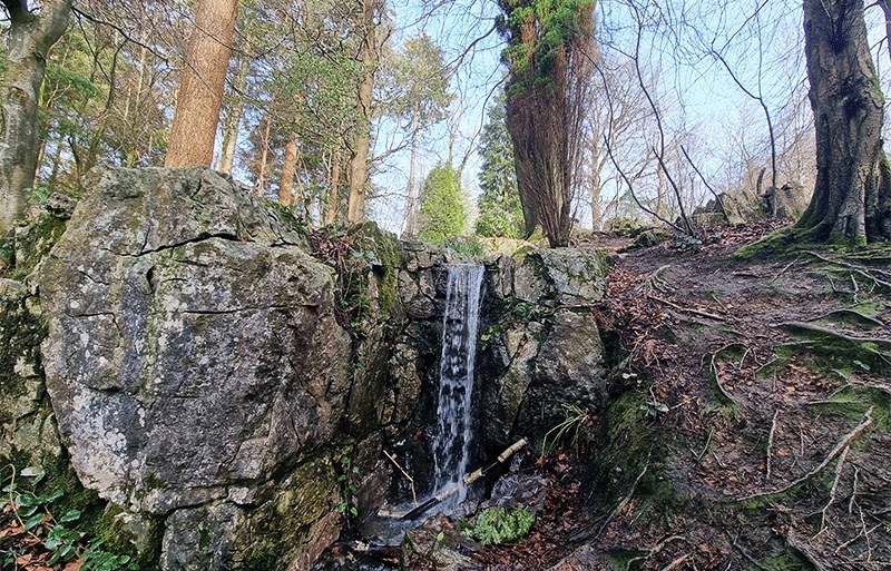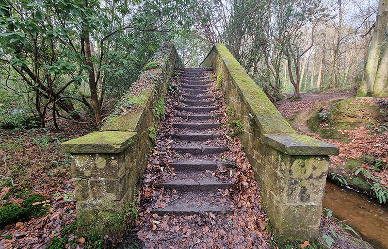 Moving along from the pool at the foot of the waterfalls, follow the stream, and you will arrive at a folly bridge with steps on one side and a slope on the other. It’s ‘reclaimed by nature look’ with ivy climbing the steps and walls to join the mosses and lichens that call the bridge home.