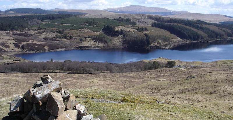 Looking southeast across the full length of the loch, the Rhinns of Kells, also known as the Corserine Range, fills the horizon with one of the most dramatic ridgelines in all of southern Scotland, its highest point Carlin’s Cairn at 2,648 feet, with Corserine rising just behind it.